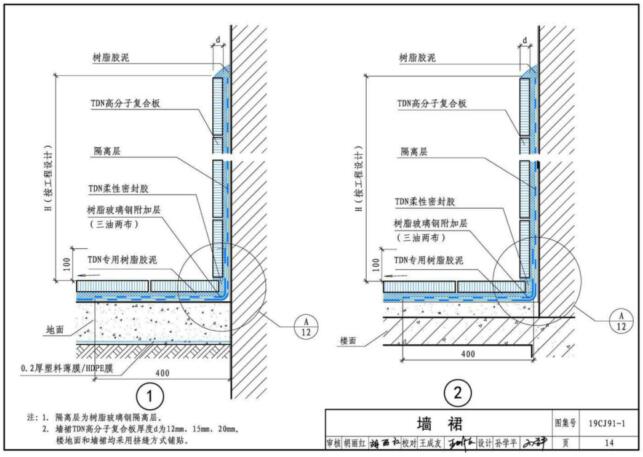 19CJ91-1是一款树脂板防腐蚀建筑构造图集,适用于TDN高分子复合板,介绍了具体的做法选用表、踢脚、管道穿楼面、设备基础、工程实例等等,满足设计和安装的需求。