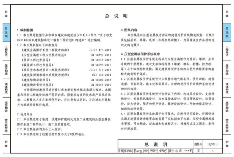 17J925-1图集是根据相关规范设计的一款压型金属板建筑构造图集,介绍了详细的屋面、枪体和地面等选材及构造做法,还有常用的板型表和附录,适用于系统工程的设计、施工和质量验收。本站提供17J925-1图集免费下载,高清PDF版本。