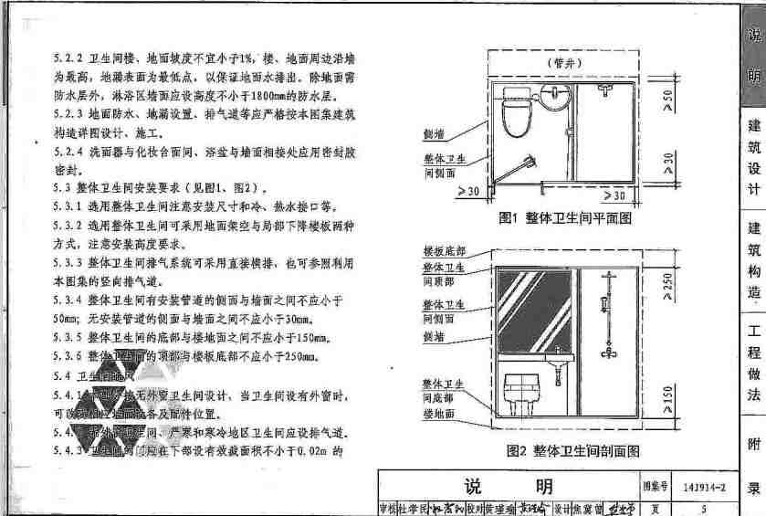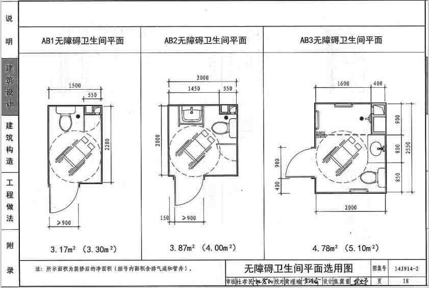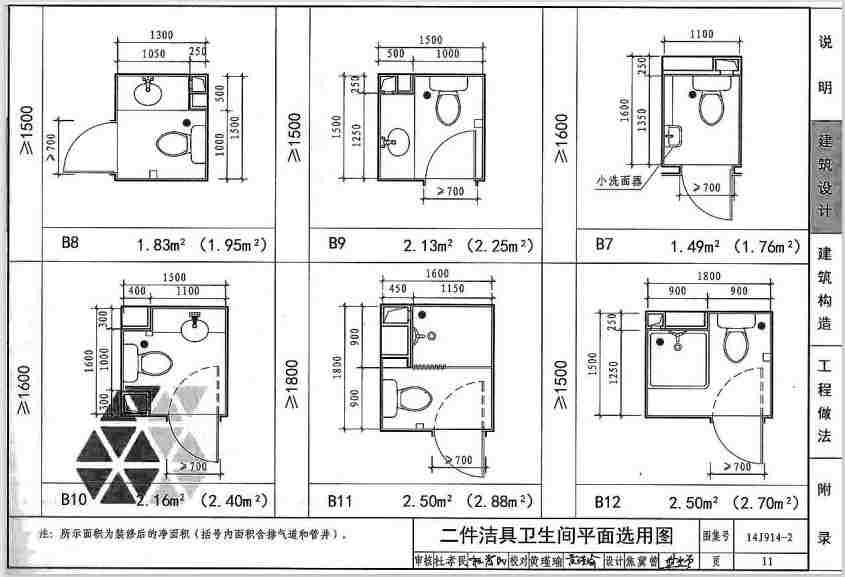 14J914-2图集是原01SJ914住宅卫生间图集的基础上改编的一款图集,介绍了不同卫生间的布置图和卫生间构件的安装和构造方法,内容全面,清晰明了,很多数据都是以数据的形式展示的,很容易理解。