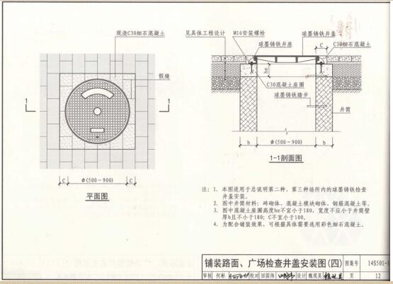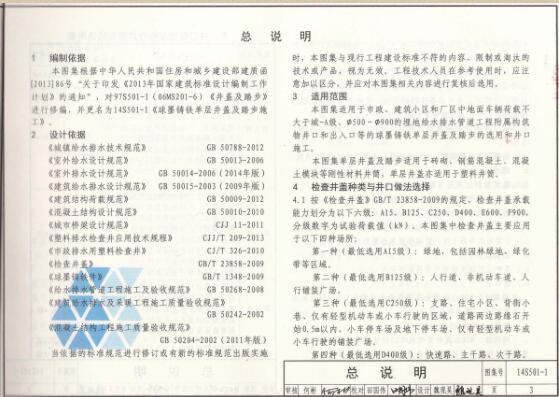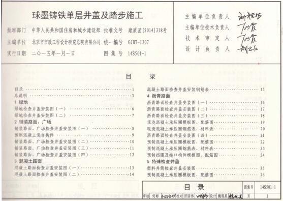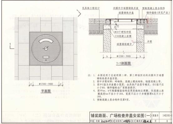 14S501-1图集是一款铸铁井盖图集,主要内容包括绿地、铺装路面广场、混凝土路面、沥青路面和特殊检查井盖的安装、配筋图以及材料表等,能够更好的指导铸铁井盖的设计、安装和施工。