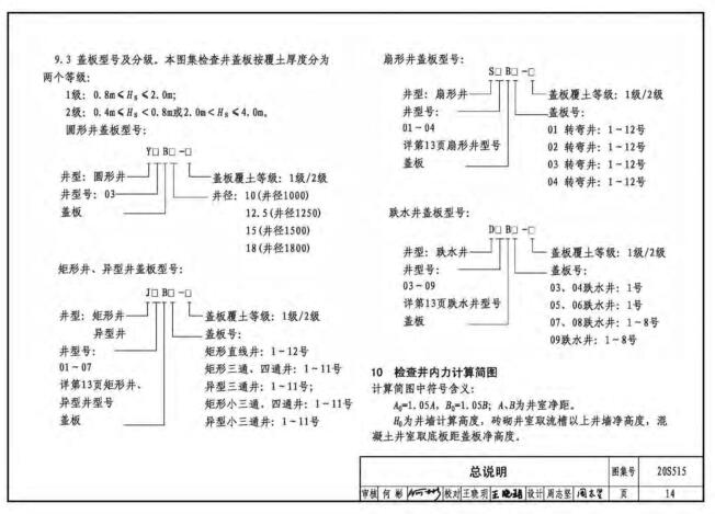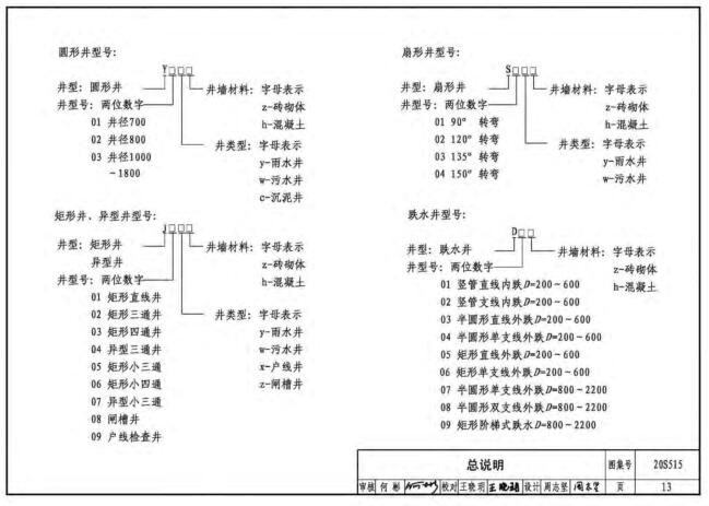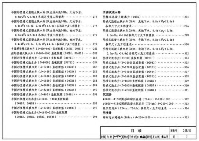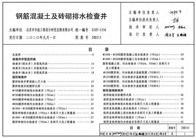 20S515钢筋混凝土及砖砌排水检查井简称排水检查井图集,主要介绍了不同类型的井型各部尺寸及工程表和井流槽形式图以及井盖板配筋等,涵盖圆形、矩形直线、矩形三通和异形检查井等,适用于一般城镇市政及水质条件满足城镇排污条件的工业与民用建筑室外无内牙的圆形排水管道。
