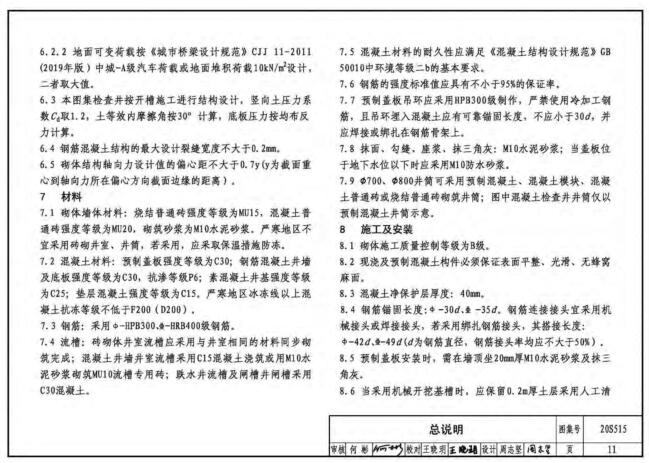 本图集适用于雨水管道管径≤3000mm,盖板顶覆土深度≤4m和污水管道管径≤2200mm,盖板顶覆土深度≤4m、干管顶覆土深度≤6m的市政、建筑小区、工业企业、民用建筑室外雨、污水管道工程。检查井按有地下水(地下水位于地面下0.5m)及无地下水(地下水位于底板以下)两种条件设计。