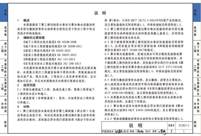 21J951-1图集是为聚乙烯丙纶卷材复合防水构造设计的一款标准图集,分为选用表、底下防水工程、平屋面防水工程、瓦屋面防水工程、有水房间和水池等内容,附录中介绍了材料性能和相关技术资料,为用户进行复合防水工程的设计提供参考,21J951-1图集免费下载,PDF高清无水印,需要的朋友可以下载!