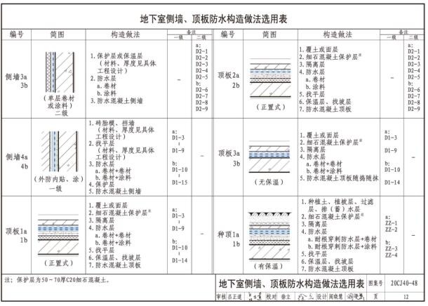 地下室侧墙、顶板防水构造做法选用表12