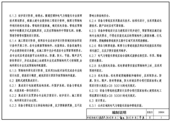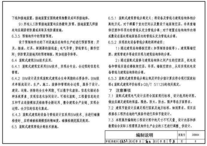 本图集表达的重点是装配式建筑区别于传统建筑的特殊做法。主要包括电气设备及电气导管安装;防雷及接地安装;装配式剪力墙结构建筑电气设计示例;装配式框架结构建筑电气设计示例;建筑信息模型(以下简称“BIM")技术应用等。